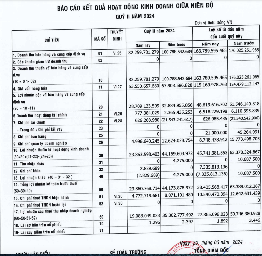 Lợi nhuận sau thuế quý 2/2024 giảm so với lợi nhuận quý 3 năm 2024 là 16.21 tỷ đồng tương ứng giảm 45,93% nguyên nhân chính là do quý 2 năm 2023 hoàn nhập dự phòng đầu tư tài chính cổ phiếu HPG