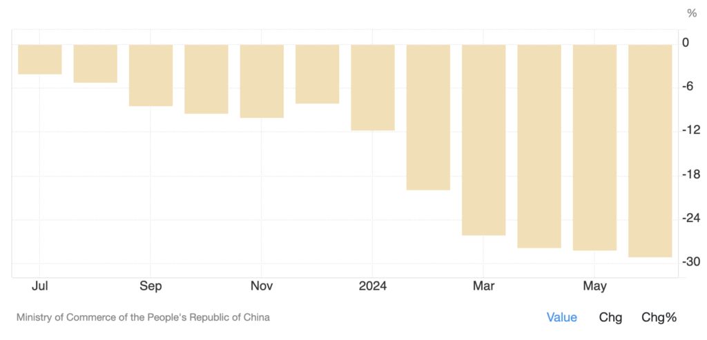Đầu tư trực tiếp nước ngoài (FDI) vào Trung Quốc đã giảm 29,1% so với cùng kỳ năm ngoái xuống còn 498,91 tỷ CNY trong giai đoạn từ tháng 1 đến tháng 6 năm 2024, mức giảm kỷ lục trong sáu tháng đầu năm. Khoảng 12,8% trong tổng số, hay 63,75 tỷ CNY đã được đổ vào các ngành sản xuất công nghệ cao, tăng 2,4 điểm phần trăm so với cùng kỳ năm ngoái. Trong khi đó, đầu tư nước ngoài vào sản xuất thiết bị và dụng cụ y tế và dịch vụ kỹ thuật chuyên nghiệp lần lượt tăng 87,5% và 43,4%. Nguồn FDI đến từ Đức (18,1%) và Singapore (10,5)%. Trong những năm gần đây, Trung Quốc đã đàn áp một số ngành công nghiệp để đảm bảo tuân thủ các chính sách của chính phủ, làm nản lòng đầu tư nước ngoài.